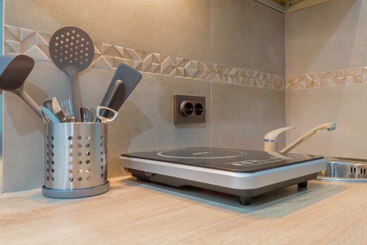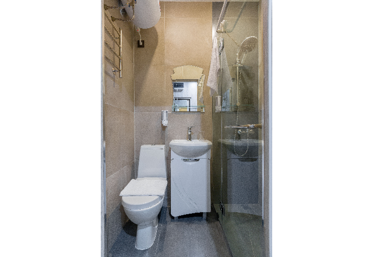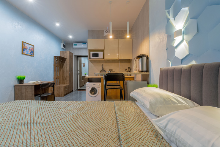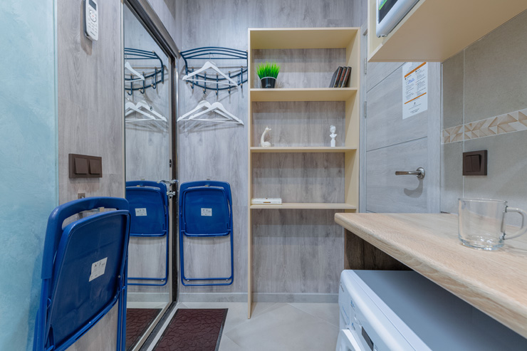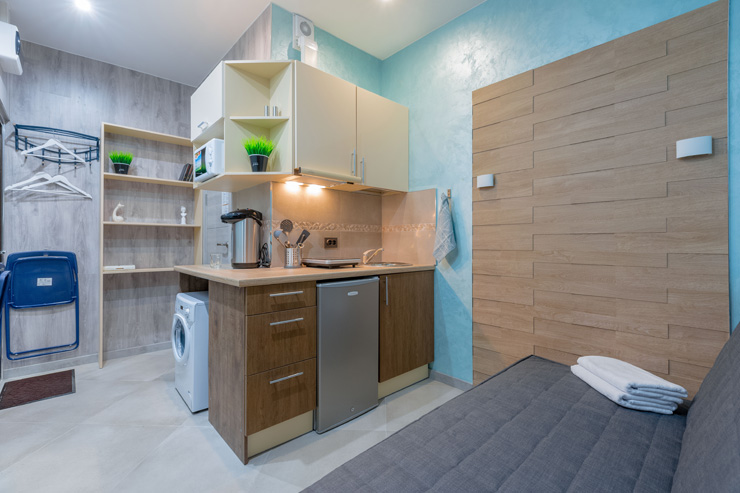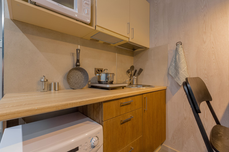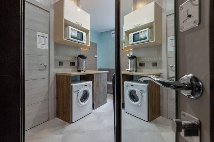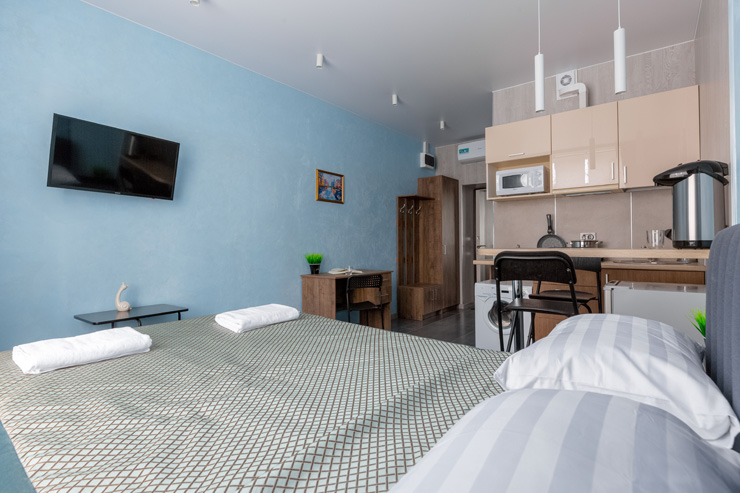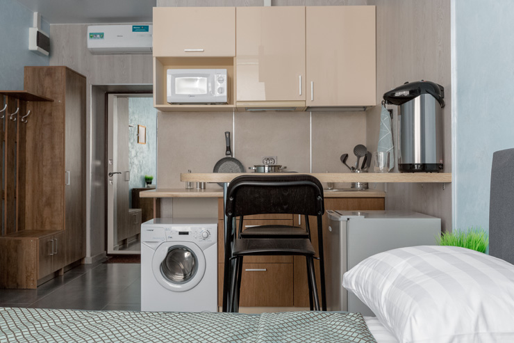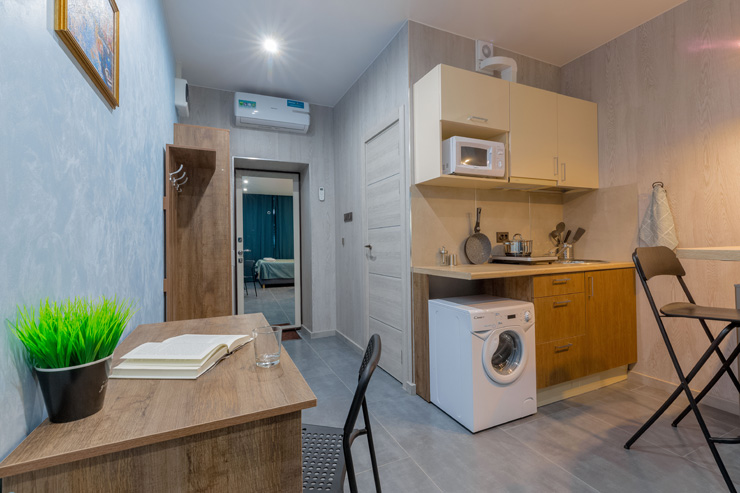 - Оборудование: гладильная доска, кофемашина, микроволновая печь, мини-холодильник, набор посуды, плита электрическая, стиральная машина, телевизор, утюг, электрочайник