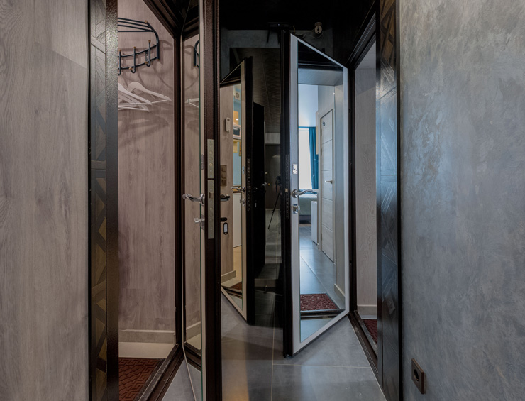 - Мебель: вешалка, диван раскладной, зеркало, прикроватные тумбочки, стол, стулья, шкаф